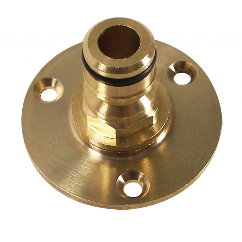 Raccordo maschio da 1/2’, compatibile con tutti i sistemi rapidi in commercio in ottone e plastica, completo di rondella Ø mm. 50 con tre fori di fissaggio.Ideale per creare punti di collegamento alle manichette per il lavaggio ponte ecc...