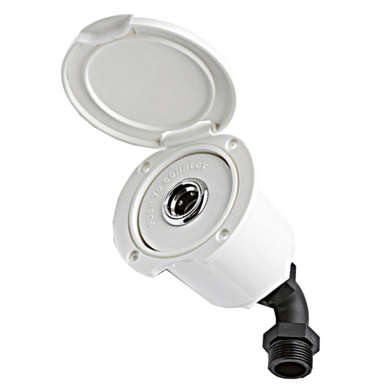 Attacco rapido femmina presa di coperta per acqua di mare (o dolce) da utilizzare a bordo perlavaggio coperta o servizi. Completo di contenitore in ABS bianco e valvola di non ritorno, attacco a gomito filetto maschio da 3/4”. Coperchio bianco