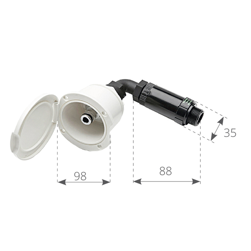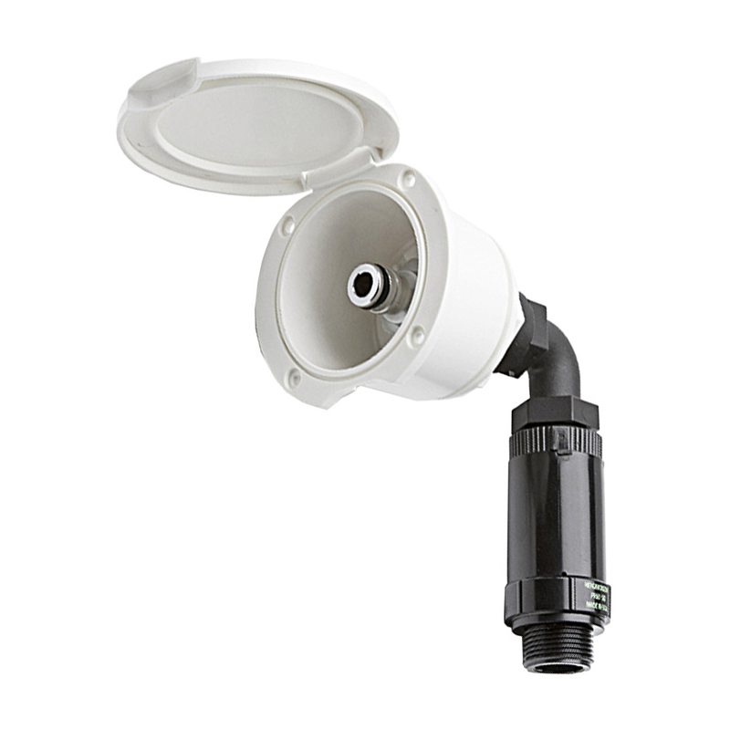 Contenitore con innesto rapido e riduttore di pressione per carico acqua dolce tramite collegamento alla rete idrica della banchina. Completo di contenitore e coperchio in ASA bianco, riduttore di pressione 2,5 bar, curva a gomito con filetto maschio da 3/4” e valvola di non ritorno.