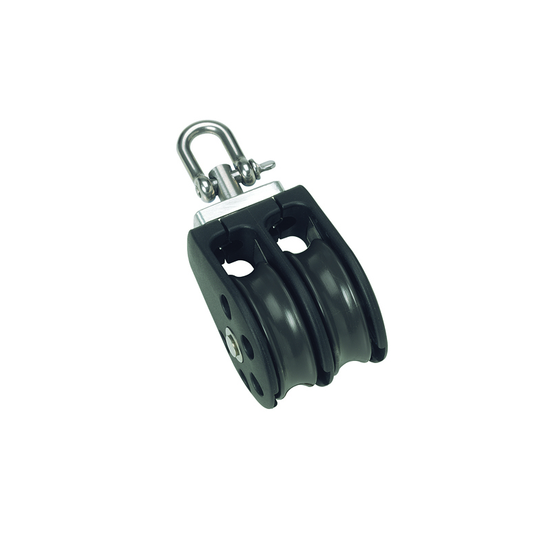 SERIE 2 - Bozzello doppio girevole, Ø cima max mm. 8, max carico di lavoro kg. 370 carico di rottura kg. 740, dimensioni puleggia mm.35 x 12, lunghezza mm. 80