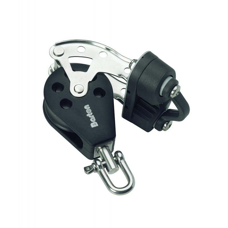 SERIE 2 - Bozzello singolo girevole con arricavo e cam, Ø cima max mm. 8, max carico di lavoro kg. 370 carico di rottura kg. 740, dimensioni puleggia mm.35 x 12, lunghezza mm. 100