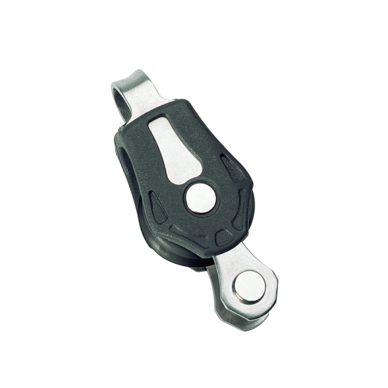 SERIE 0 -Bozzello singolo con occhio fisso ed arricavo, Ø cima maxmm. 5, max carico di lavoro kg. 275, carico di rottura kg. 550, dimensioni puleggia mm.20 x 8, lunghezza mm. 52.2