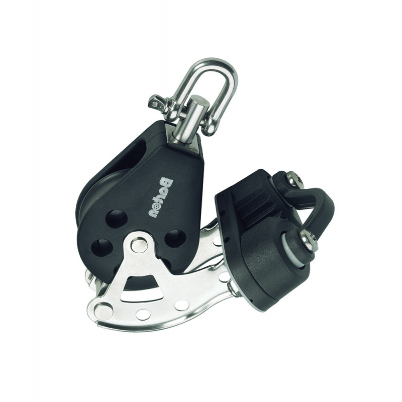SERIE 4/5 - Bozzello singolo girevole con arricavo e cleam cleat, Ø cima mm. 12, max carico di lavoro kg. 750 carico di rottura kg. 1500, dimensioni puleggia mm.54 x 17, lunghezza mm.153