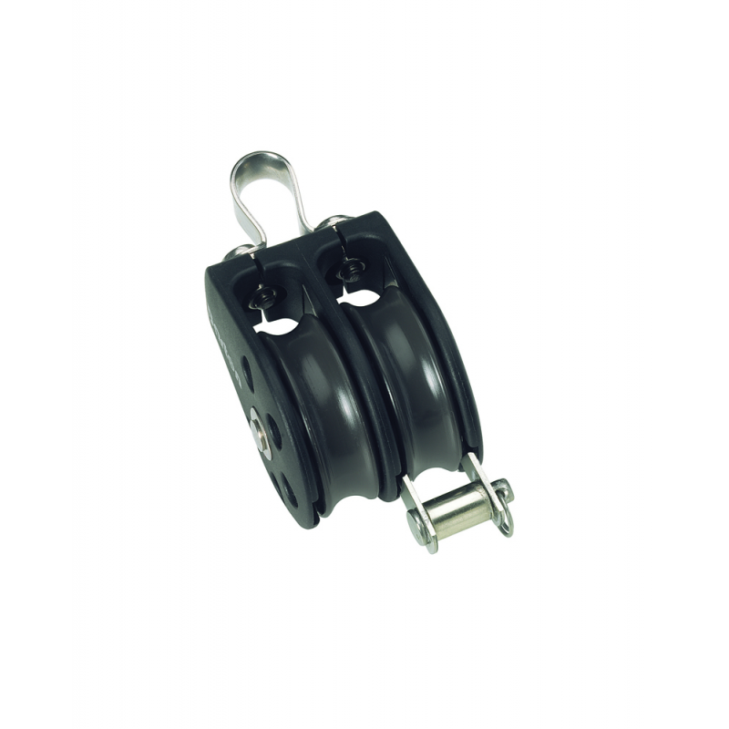 SERIE 2 - Bozzello con puleggia, Ø cima max mm. 8, max carico di lavoro kg. 370 carico di rottura kg. 740, dimensioni puleggia mm.35 x 12, lunghezza mm. 76