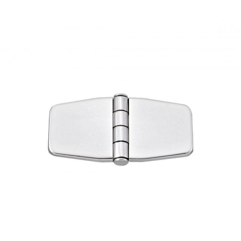 Cerniere con copertura in acciaio inox AISI 316 spessore mm.2. Tramite il nastro biadesivo 3m vhb premontato sulla copertura stessa, permette di nascondere le viti della cerniera dopo il montaggio, con grande effetto estetico. dim. mm. 76X37, perno semincassato.