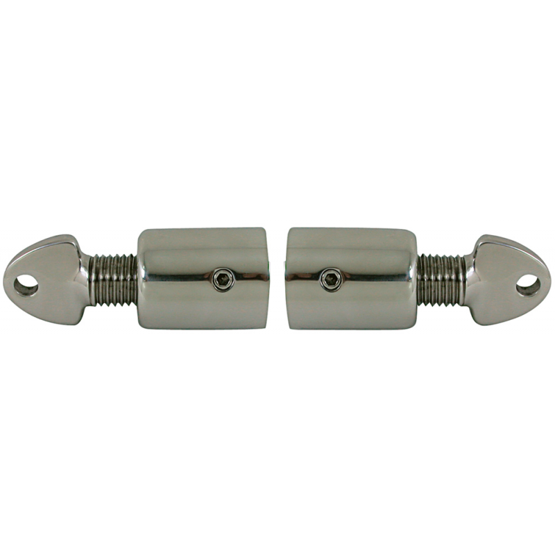 Coppia di giunti a cappuccio in acciaio inox AISI 316 con occhio regolabile. Permettono di tendere la capottina con escursione di 50 mm.