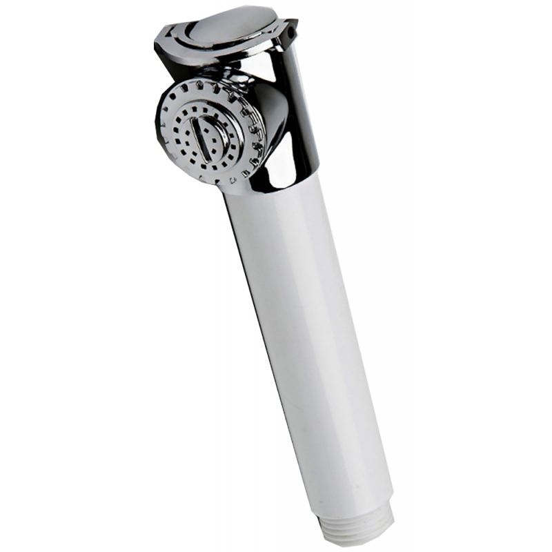 Doccia con testa in ottone cromato e impugnatura in ABS bianco, con pulsante push-off. Attacco 1/2” maschio. Per tubo art. 2424212/4 o similari.