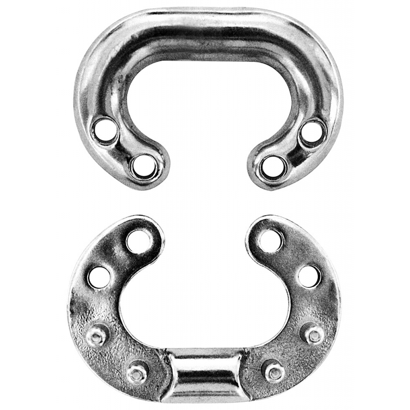 Falsamaglia in acciaio inox AISI 316 di giunzione per catena calibrata, con nr. 8 perni di tenuta per un’alta resistenza al carico di lavoro e rottura. Ø mm.6. Dim interne maglia mm. 33x23.