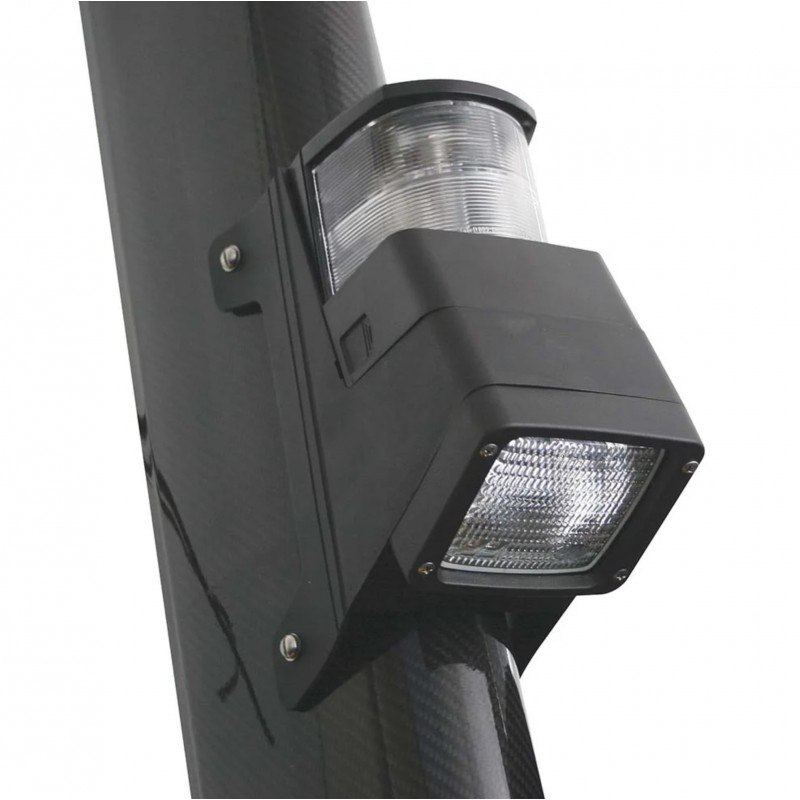 Fanale testa d'albero e proiettore da ponte combinati in un unico robusto alloggiamento in plastica resistente ai raggi UV e agli urti. Lampadine BAY15d da 12V/10W e H3 da 12V/55W incluse. I bracci dell'alloggiamento si flettono per adattarsi all'albero. La lampada di testa d'albero e il proiettore di coperta sono cablati separatamente.Adatto a imbarcazioni di lunghezza inferiore a 20 m.
