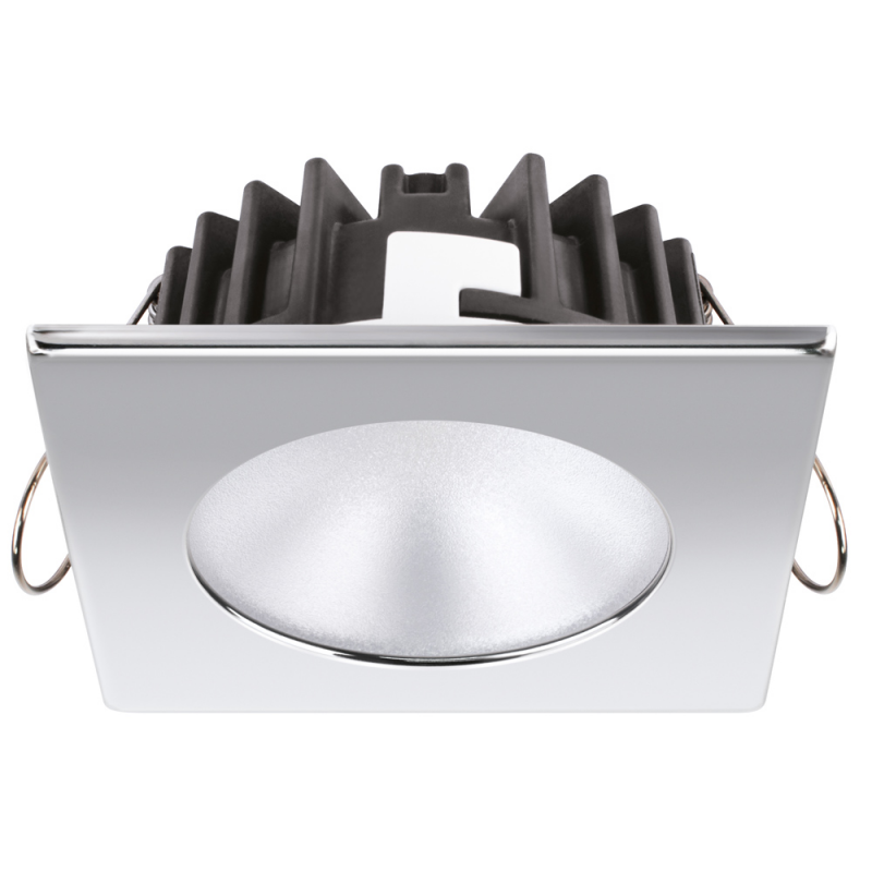 Faretto stagno IP 66, POWER LED ( 245 Lumen ) ad altissima luminosità, luce bianca calda con cornice quadrata in acciaio inox AISI 316 lucido.Sensibile alla polarità. Fissaggio con molle.