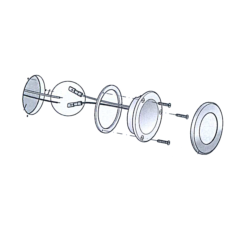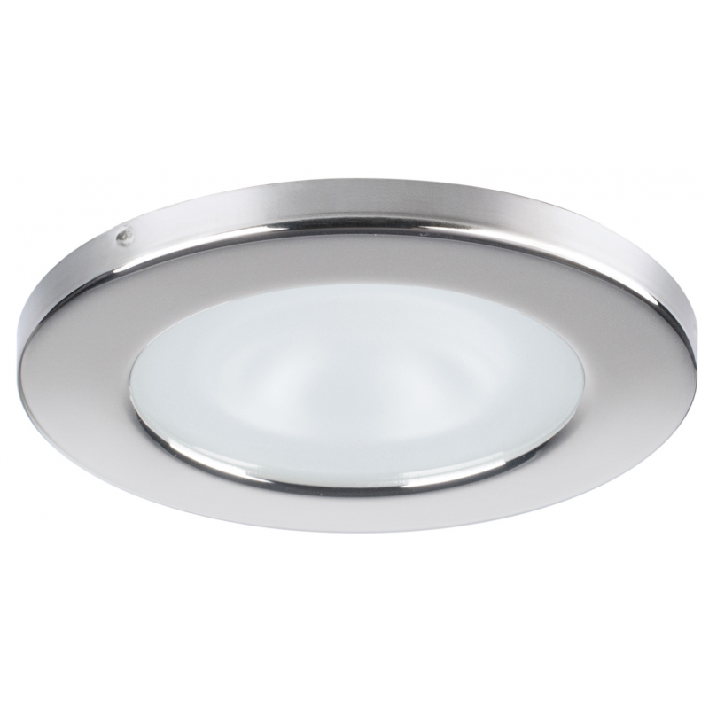 Faretto stagno IP65 ad alta luminosità ( 252 Lumen ), luce bianca calda, con cornice circolare in acciaio inox AISI 316 lucido. Sensibile alla polarità.Fissaggio con viti (non incluse).