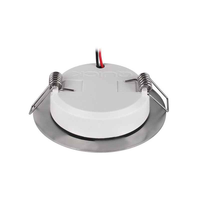 Faretto stagno IP65 a 2 LED (100 Lumen) ad alta luminosità, luce bianca calda con cornice circolare in acciaio inox AISI 316, con pulsante touch on/off e regolatore intensità. Sensibile alla polarità. Fissaggio con molle.