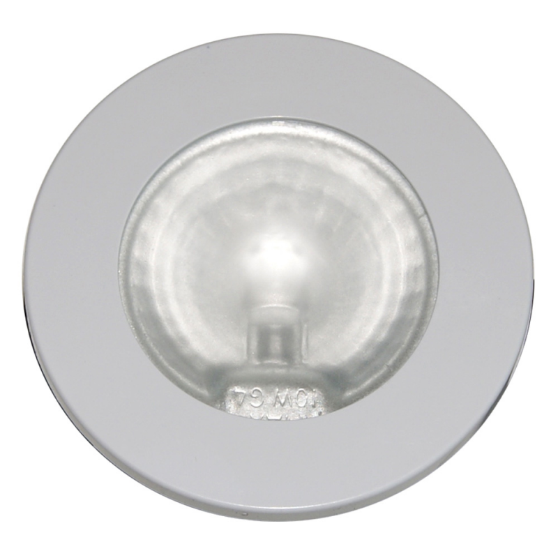 Faretto alogeno in materiale termoplastico ad incasso Ø esterno mm. 70, Ø foro mm. 54, spessore mm. 14,4. Vetro di protezione sabbiato, completo di lampadina alogena 12V 10 W 3 fori di fissaggio. Ricambio lampadina a LED 4090322.