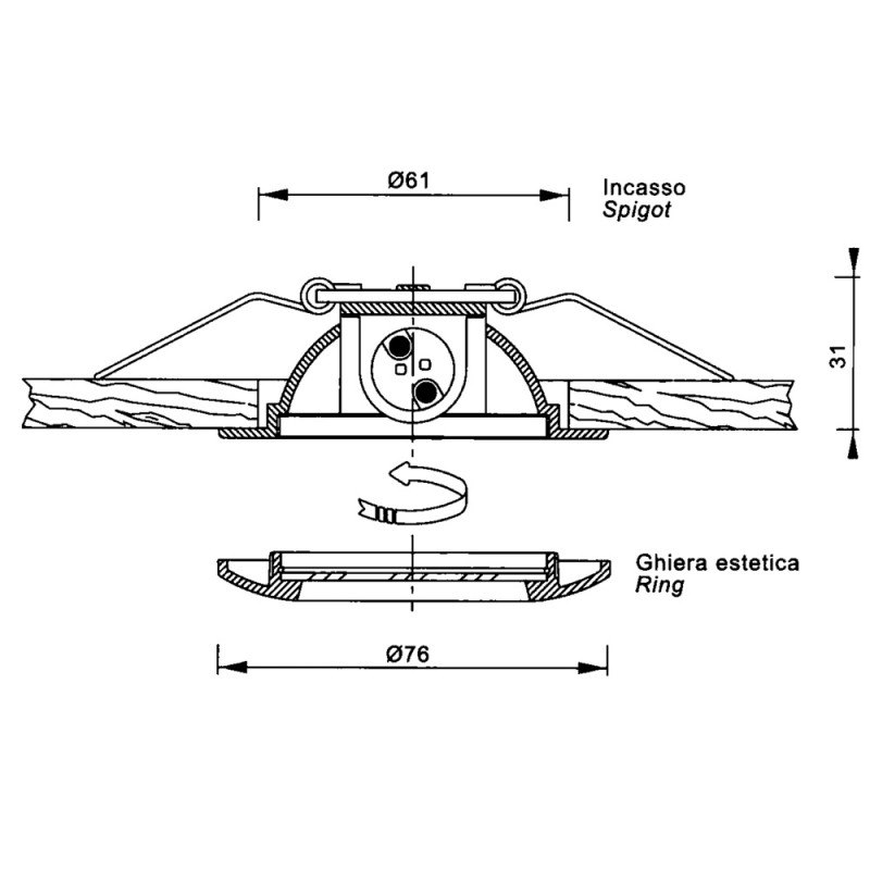 Faretti ad incasso in ottone pressofuso, con vetro temperato e satinato. Fissaggio a molla. Lampadina (non compresa) per innesto G4 art: 4090318