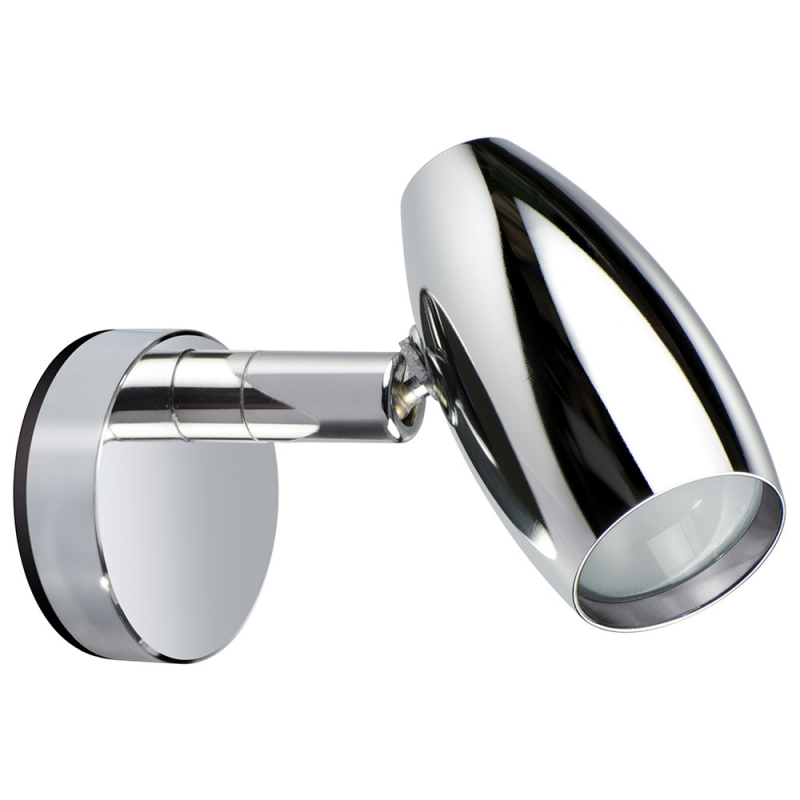 Faretto orientabile da interno fabbricato in alluminio con finitura cromata, dotato di interruttore. Luce bianca calda (140 lumen). Fissaggio a parete con viti. Sensibile alla polarità.