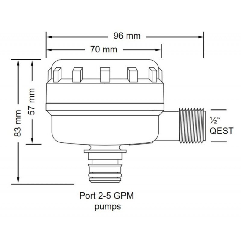 Filtro a 40 maglie, con design a 90°, filettatura QEST da 1/2 per uscita porta a innesto (m) per pompe da 2-5 GPMIdeale per sistemi di acqua pressurizzata e sistemi ad alta pressionePer applicazioni con acqua potabile e salataPortata massima 23 litri al minuto (6 GPM)Pressione massima 5 bar (70 PSI)Temperatura massima 70 C°Il tappo a vite trasparente consente una rapida ispezione e pulizia dell'inserto filtrante in acciaio inox.