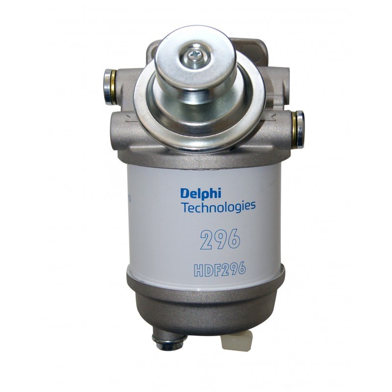 Filtro decantatore gasolio/benzina completo di pompa a mano per riempire il circuito, in lega leggera pressofusa, vite di spurgo, 2 ingressi, 2 uscite. Portata 50 lt./h. Completo di 2 tappi, filettature F da mm. 1/4x1,5. Dim. mm. 170 x 93 x 93