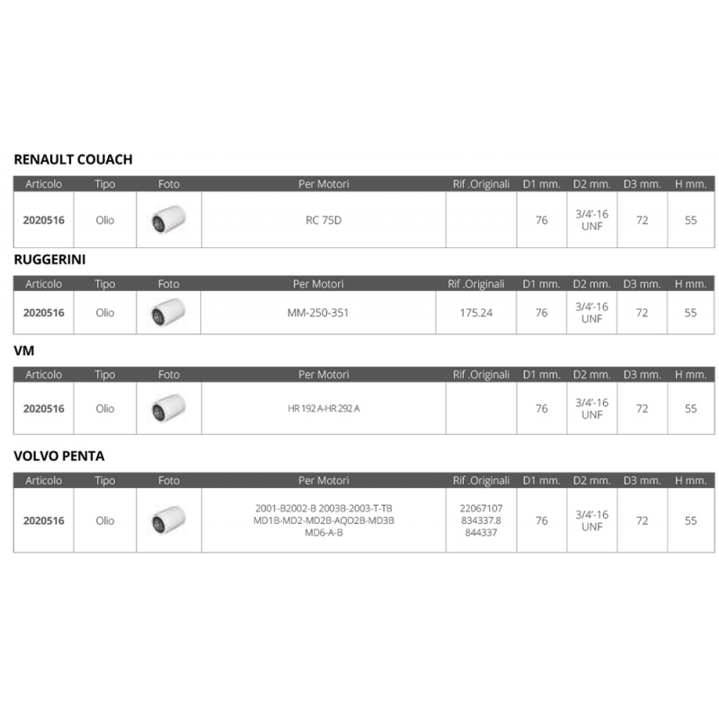 Filtro olio dim.Ø est.mm.76 Ø guarnizione mm. 72 altezza mm.55 passo 3/4’ - 16 UNF
