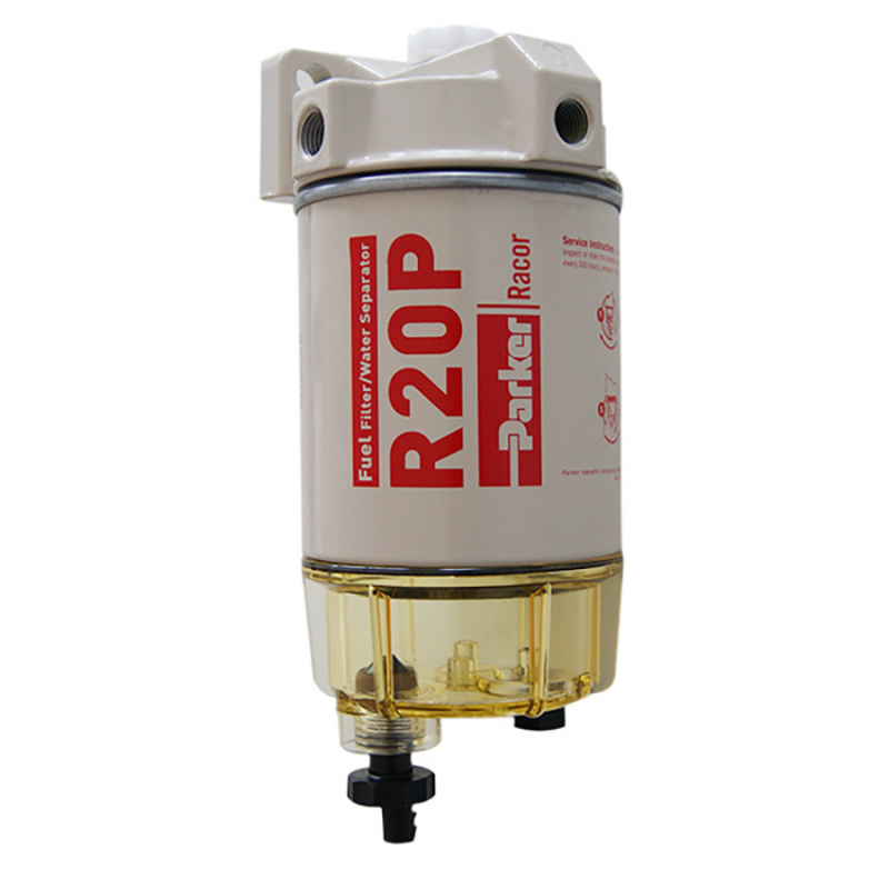 Filtro separatore acqua/gasolio Racor serie SPIN-ON, può essere montato sia sul lato mandata che sul lato aspirazione della pompa gasolio. Raccorderia non fornita.