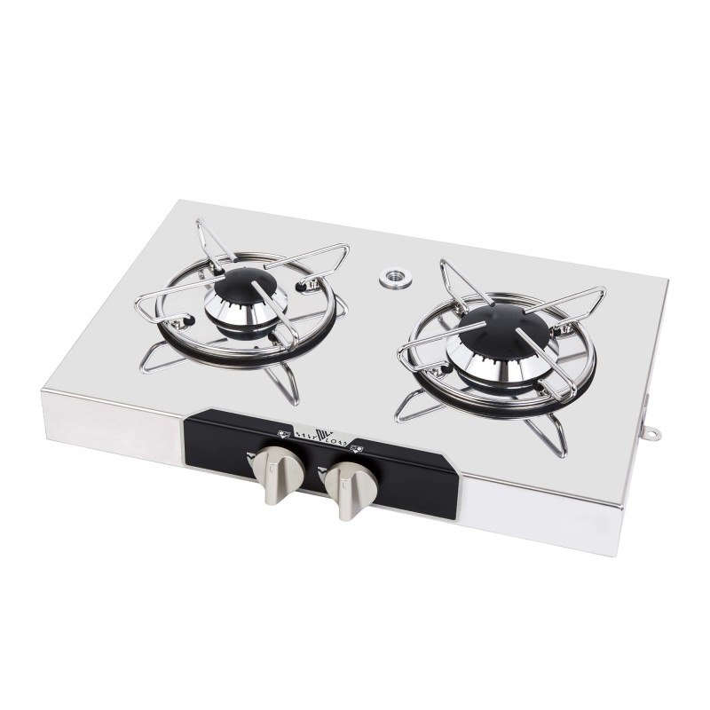 Piano cottura da appoggio a gas con accensione manuale, in acciaio inox lucidato a specchio. Con termocoppia di sicurezza. Completo di staffe e viti di fissaggio. Con foro per ferma pentole. Certificati CE.