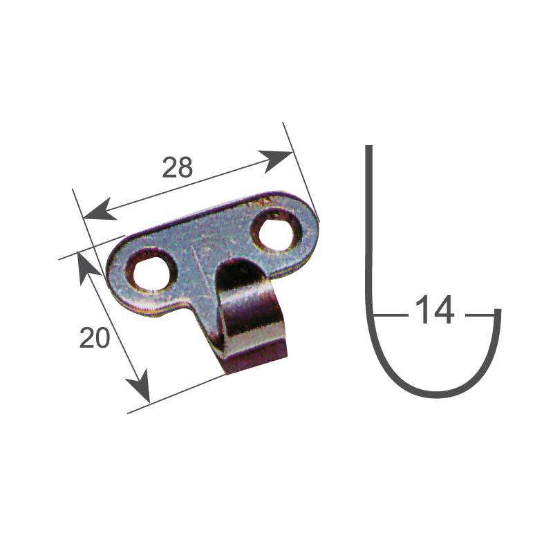 Gancetto in acciaio inox stampato, base con due viti di fissaggio. Dimensioni mm. 28x20x14.