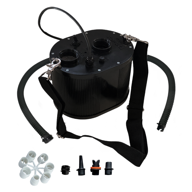 Gonfiatore e sgonfiatore elettrico a 230V. Pressione massima mbar 170 (2.9 psi) , potenza 600w. Completo di tubi e raccordi.