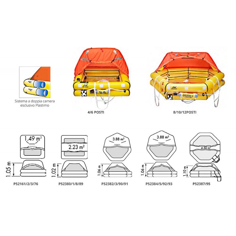 Progettata per la navigazione in condizioni estreme, certificata ISO9650-1 e catalogata in classe A (attivazione a -15°C) è costruita con pavimento a doppio isolamento con arco ad apertura automatica e luce esterna 4.3 cd. E’ dotata di ampie tasche di contenimento per le dotazioni di sicurezza e di sopravvivenza, di una grande ancora galleggiante e di una scala reversibile zavorrata che permette una facile e comoda risalita dal mare. Sono disponibili due tipi di equipaggiamenti di sopravvivenza a seconda del tempo previsto che la vittima può spendere nella zattera in attesa del salvataggio: quello standard, senza acqua potabile e cibo, se le forze di soccorso sono attese entro 24 ore di permanenza in mare, quello di emergenza, che include anche acqua e cibo, se le forze di soccorso sono attese oltre le 24 ore di permanenza in mare.