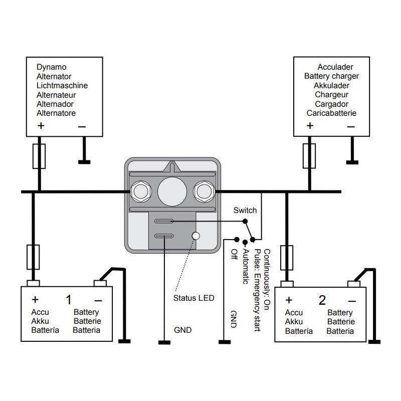 Charge Mate è un relè da batteria automatico che collega due sistemi di batterie quando il voltaggio supera un valore pre-settato (>13V a 12V / >26V a 24V) per almeno 5 secondi permettendo ai due sistemi di batteria di caricarsi simultaneamente. Quando il voltaggio scende (<12,75V a 12V / <25,50V a 24V), i sistemi di batteria saranno nuovamente isolati. Mediante un interruttore (non incluso) il caricatore può essere usato per mettere i parallelo un solenoide per avviamenti di emergenza. Rif. Originale 83302502