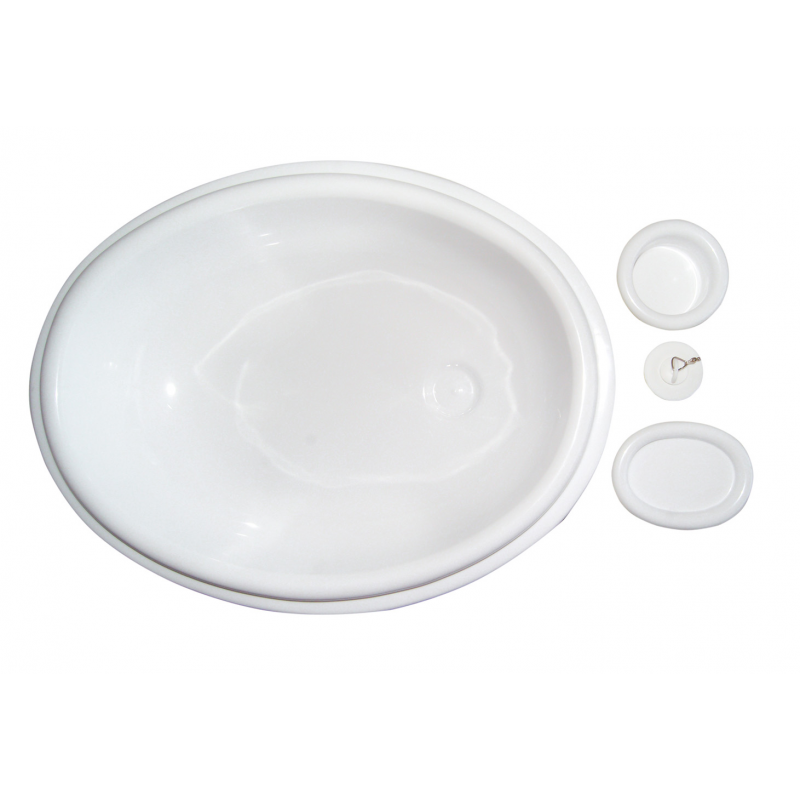 Lavello ovale in PVC bianco per bagno completi di scarico con piletta (art. 2424030). Altezza totale mm 80, esterno mm 465x365, taglio mm. 300x400, Profondità incasso mm 60