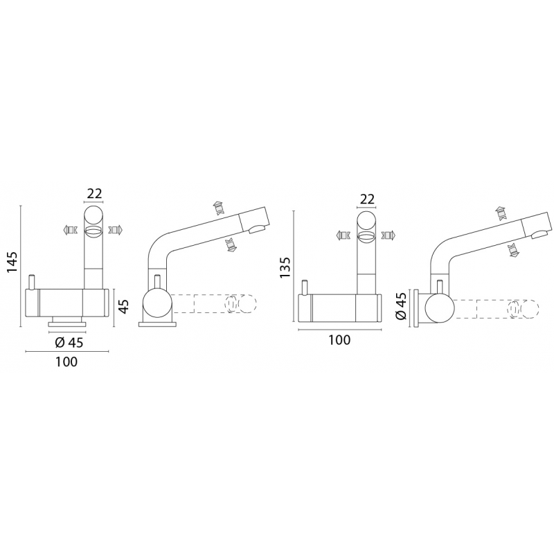 Rubinetto miscelatore monoforo per lavabo abbattibile. Fornito completo di flessibili da 3/8’ femmina. Ø mm 45. Portagomma 3/8”