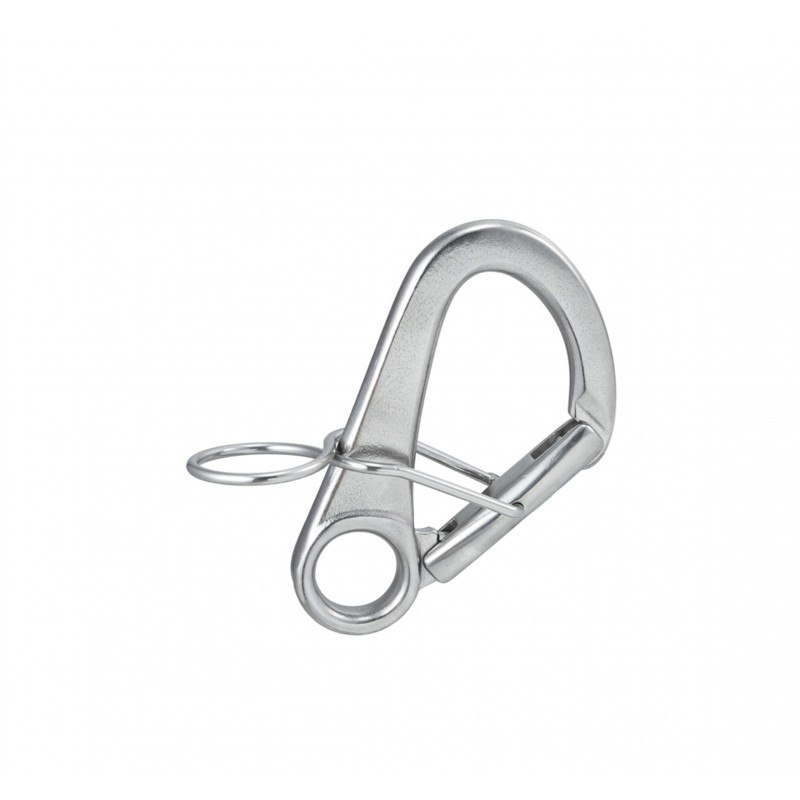 Moschettone in acciaio inox AISI 316, per aggancio e sgancio dai gavitelli di ormeggio. Dimensioni mm. A=108 B=63 C=21 D=35. Carico di rottura 395 Kg.