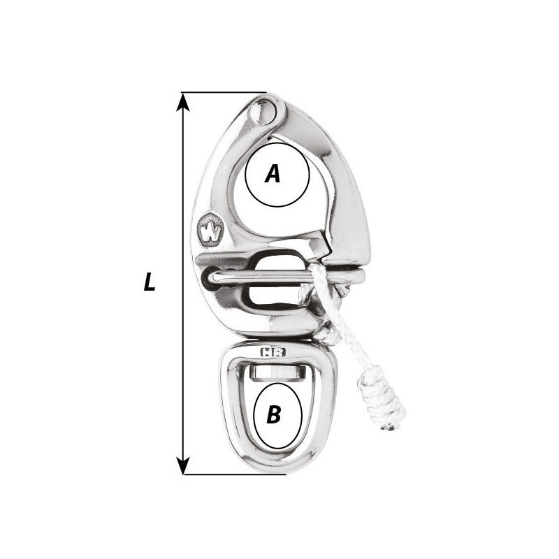 Moschettone realizzato in acciaio inox HR (grado 17.4 ph) con occhio girevole. A sgancio rapido, con apertura esterna. L’apertura avviene tirando la cimetta. Carichi di rottura certificati.