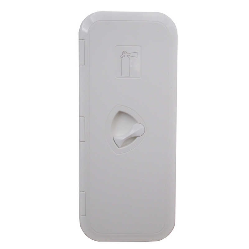 Nicchia in ABS bianco porta estintore con sportello e maniglia di chiusura, dim.mm. lung. 170 x prof. 120 x 410 h, taglio mm. 350 x 115. Adatta per estintori da kg.1