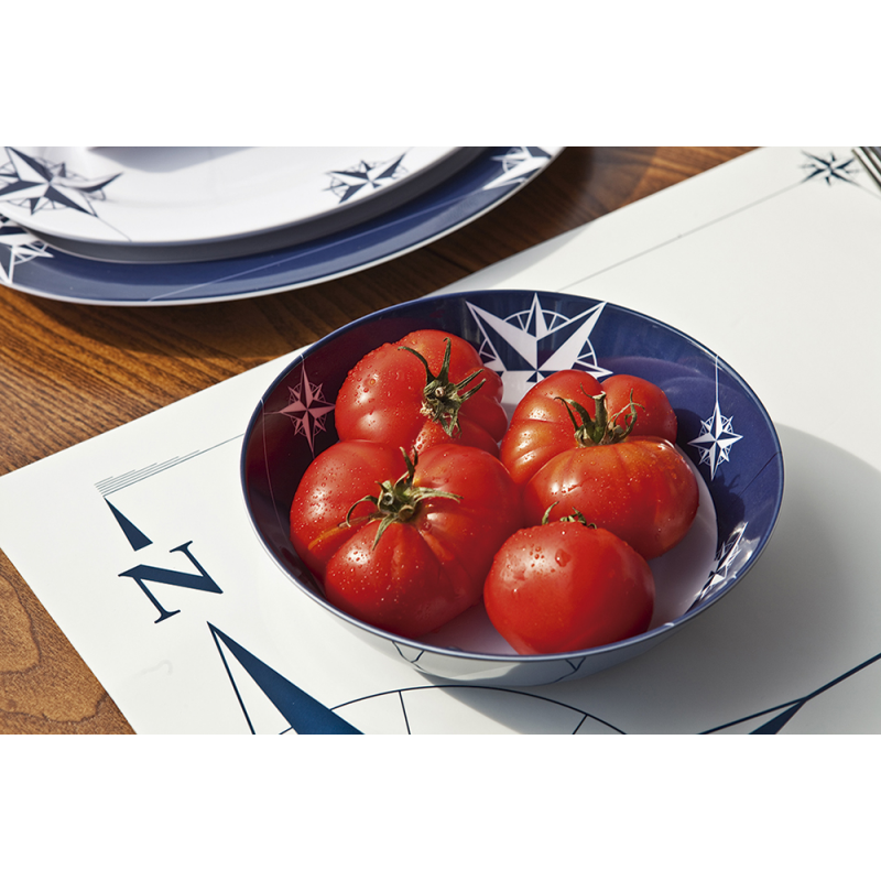 Servizio da tavola realizzato in melamina al 100%. Sui toni del blu navy e bianco. Lavabili in lavastoviglie. Le stoviglie, le tazze e i bicchieri hanno un anello antiscivolo alla base che ne impedisce lo scivolamento sul tavolo.