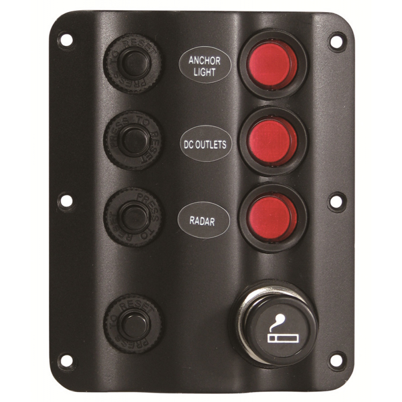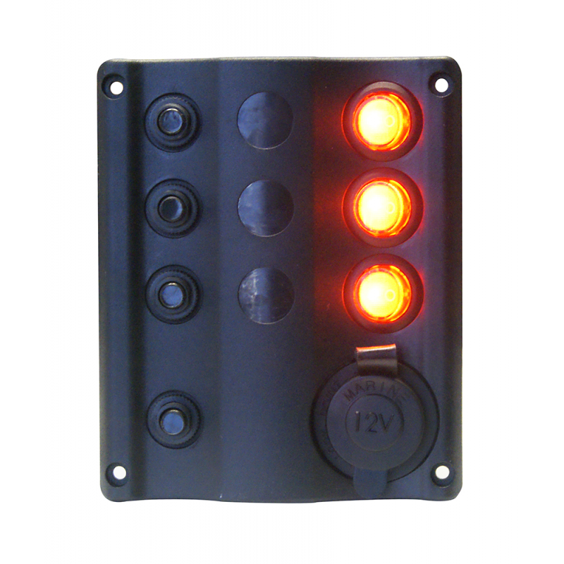 Pannello elettrico in plastica nera con interruttori ON-OFF basculanti, Luce a LED per indicare la linea attiva, magnetotermici di protezione sovraccarico e presa accendisigari con protezione da 15A MAX o voltmetro. Per impianti a 12 vdc.