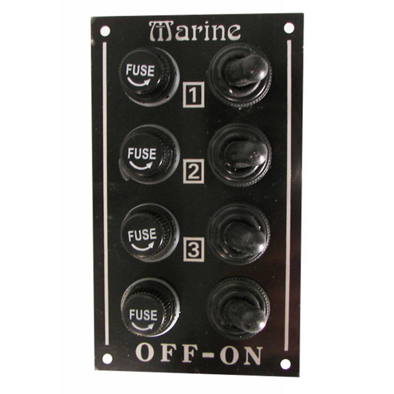 Pannello elettricoin alluminio nero con interruttori a leva protetti da cappuccioin gomma e portafusibile con fusibile in vetro da 5AMP (5x20) 3930002/5/10.