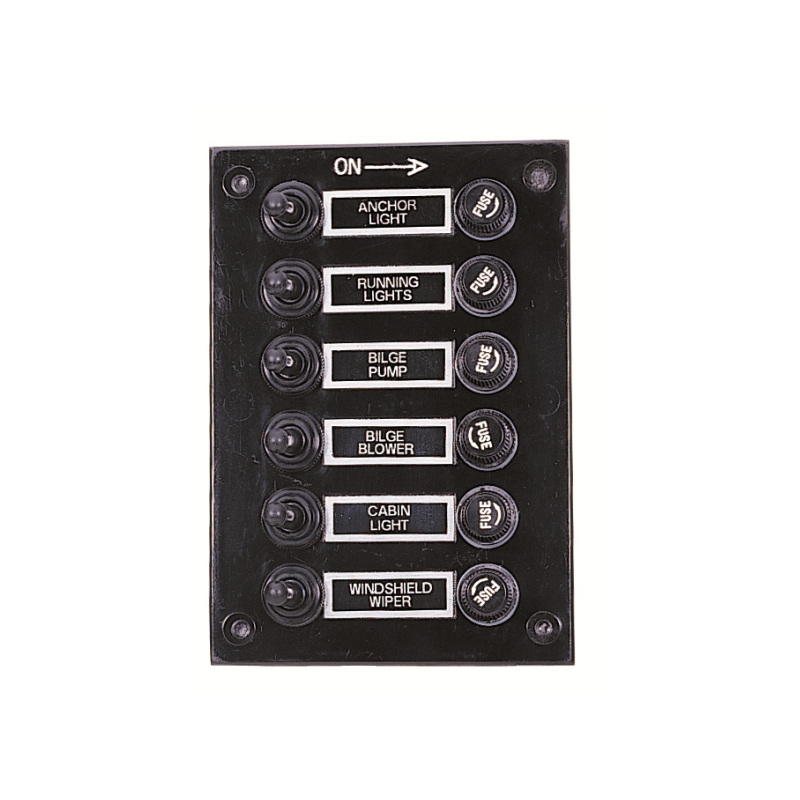 Pannello elettricoin ABS nero, con interruttori a leva protetti da cappuccio in gomma e portafusibili completi di fusibili invetro da 5 AMP (6,3x32).