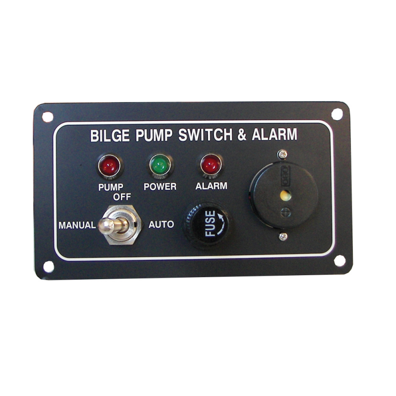 Pannello per pompe di sentina elettriche in lega leggera anodizzata. Da usare con interruttore automatico. Completo di allarme luminoso e sonoro per presenza acqua, AUTOMATICO-OFF-MANUALE con porta fusibile di sicurezza. Alimentazione 12/24V. Dimensione mm.115 x 64.
