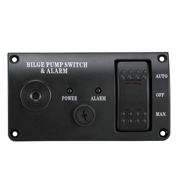 Pannello in Abs nero per pompe di sentina. Completo di allarme luminoso e sonoro per presenza acqua in sentina, interruttore basculante AUTOMATICO-OFF-MANUALE e fusibile di sicurezza. Alimentazione 12v. Dimensione mm 115 x 63