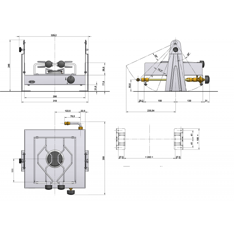 Piano cottura in acciao inox lucidato a specchio, a gas butano/propano, con parafiamma laterale, termocoppia di sicurezza e fermapentole.Omologato CE/AGA/USCG. Ugello di collegamento cucina / impianto a gas da acquistare a parte.