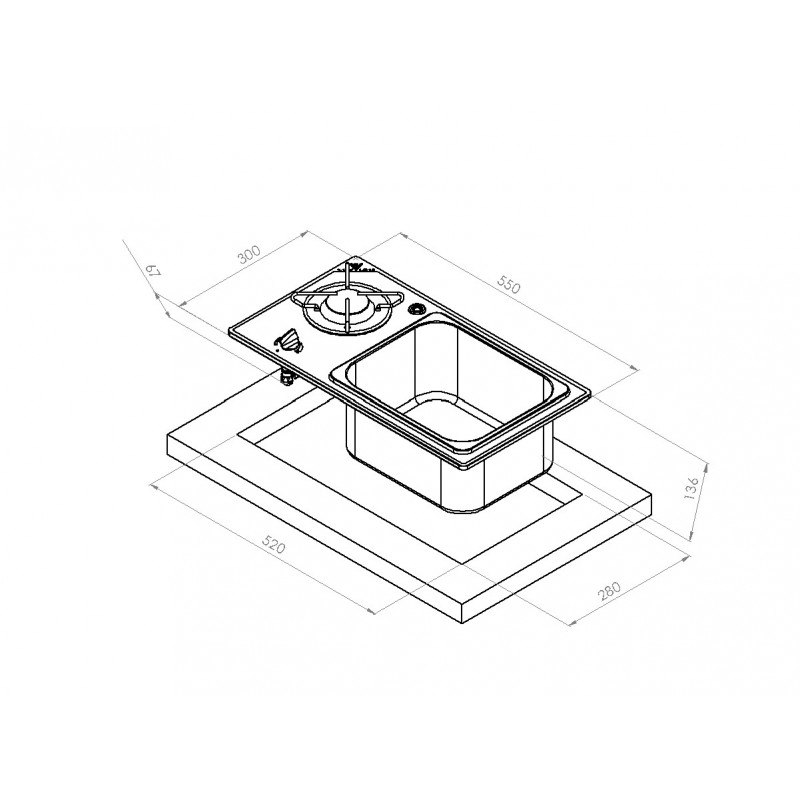 Piano cottura con lavello, a gas con accensione manuale, in vetro temperato nero con spessore di 8 mm. Montaggio ad incasso. Con termocoppia di sicurezza. Piletta non inclusa. Con foro per ferma pentole. Certificati CE.