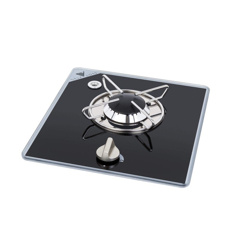 Piano cottura a gas con accensione manuale, in vetro temperato nero con spessore di 8 mm. Montaggio ad incasso. Con termocoppia di sicurezza. Con foro per ferma pentole. Certificati CE.