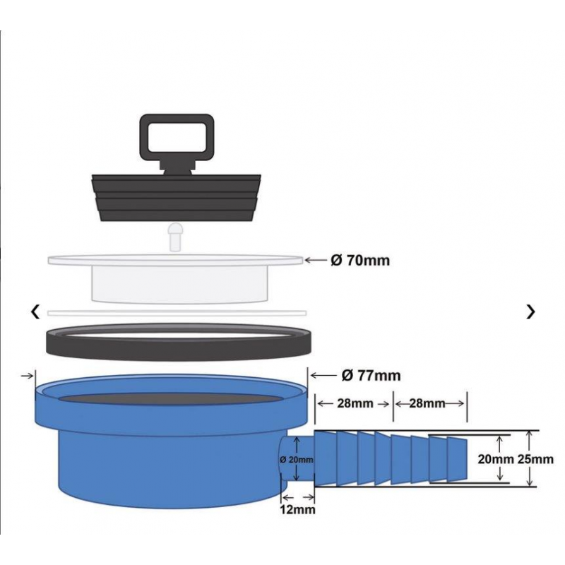 Piletta scarico curvacompleta di guarnizione in gomma e tappo.