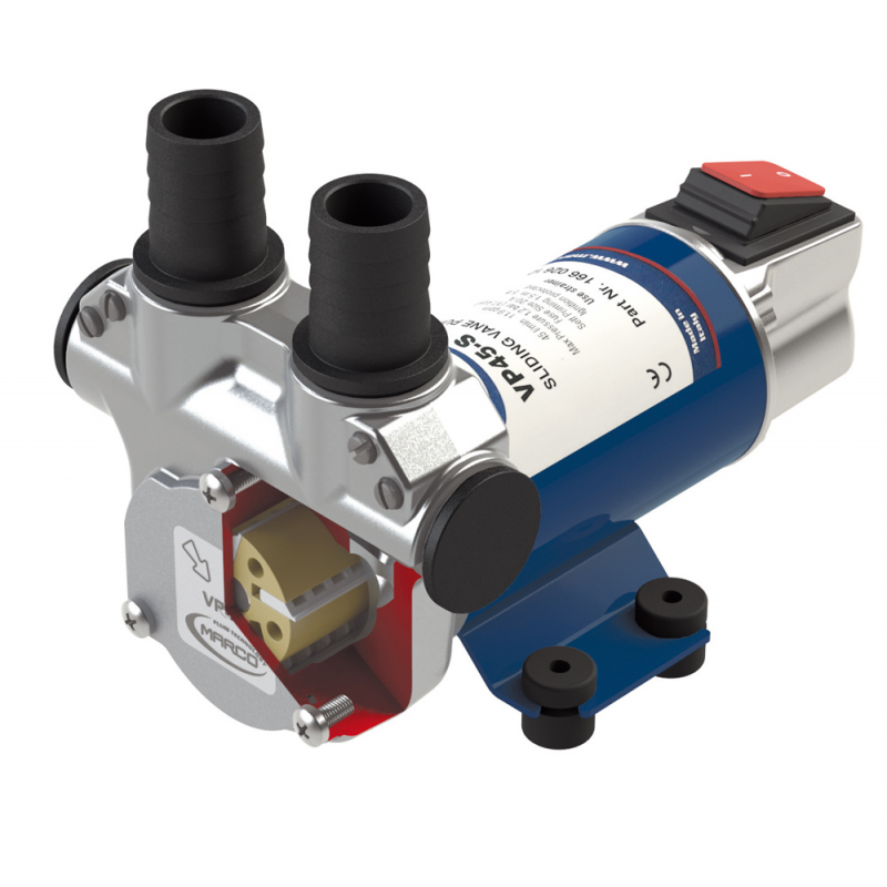 Pompa a palette autoadescante dotata di interruttore ON-OFF integrato, valvola by-pass, corpo inalluminio con doppia possibilità di connessione. Ideale per cicli di lavoro continuativi. Portata Lt./min. 45.