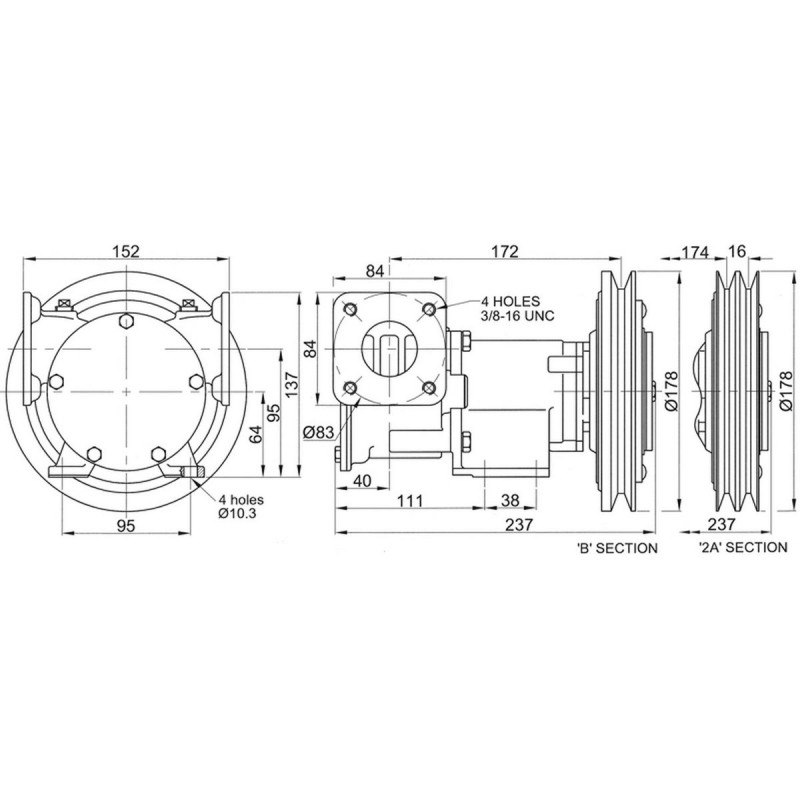 Pompa in bronzo da 1-1/2"", misura 200, montata su piede con porte flangiateFrizione elettrica a 24 volt cc con puleggia da 2 ACollegamenti: porte flangiate con foro nominale da 1½" con controflange da 1½" BSPDimensione del fusibile: 2,5 (ampere)Portata: a 1500 giri/min 195 litri/minuto (43 galloni/min) a 3 m di prevalenza totalePompa per lavaggio sentina e ponte per impieghi gravosiCorpo in bronzo, albero in acciaio inossidabile, tenuta meccanica dell'alberoGirante in neoprene di serie per prestazioni ottimali con acqua pulita o leggermente contaminata. Opzione in nitrile per l'uso con acqua oleosa.Autoadescante fino a 3 m di sollevamento verticale