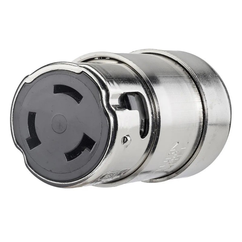 Presa in ottone cromato a tre fili, contatti in nichel anticorrosione. A Norme CEE, per Il collegamento della orrente dalla banchina alla barca.