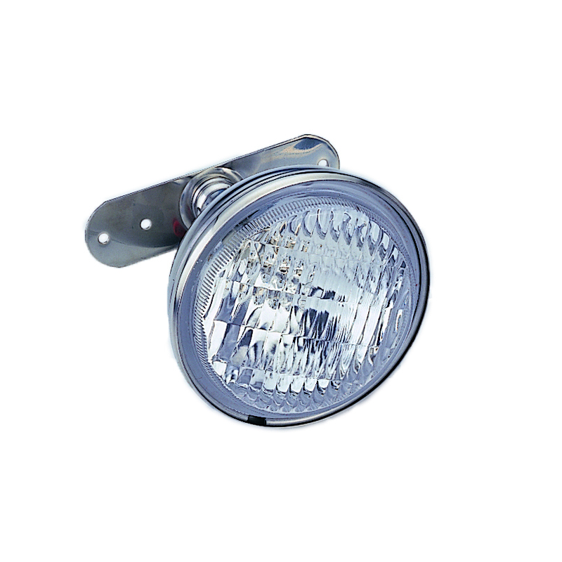 Proiettore di crocettain acciaio inox a luce diffusa con giunto sferico snodato. Dim. parabolaØ mm. 100, alt. mm. 120. Completo di lampadina alogena H3 55W 12 V.