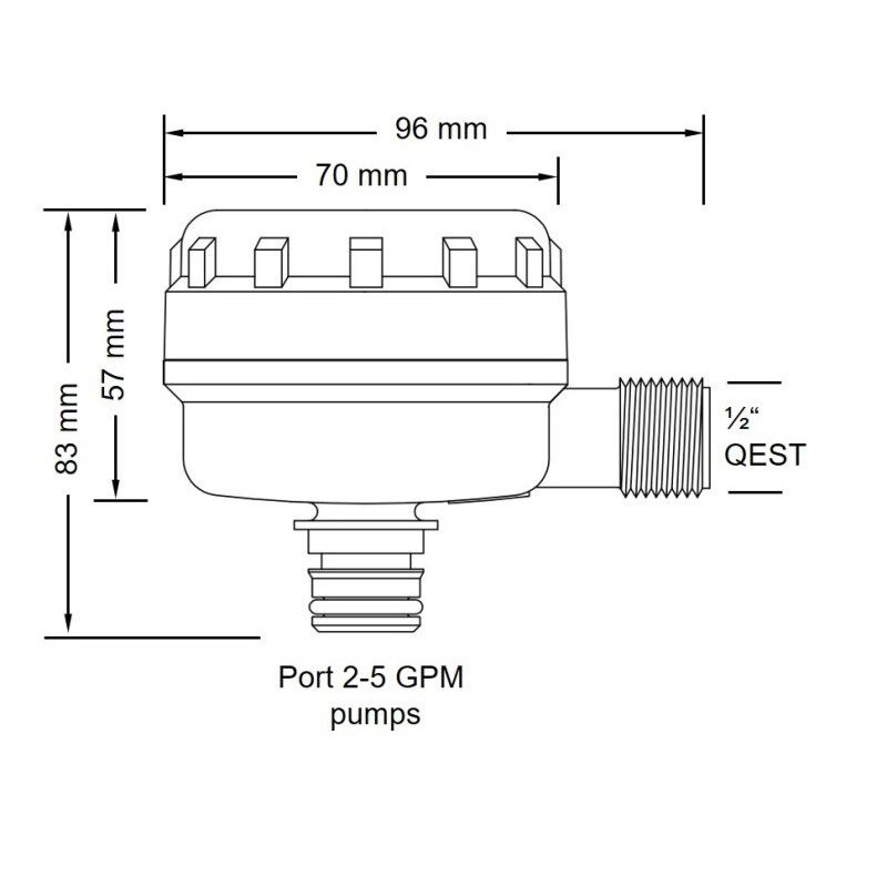 Pumpgard filtro con 40 maglie per pollice quadrato (aperture di circa 0,4 mm) a 90° con attaco per tubo da 1/2" filettato e uscita attacco a innesto per pompe 2-5 GPM Jabsco / Flojet. Portata massima di 23 LPM (6 GPM). Pressione massima 5 bar (70 PSI). Dimensioni: lunghezza circa 96 mm / larghezza circa 70 mm / altezza circa 83 mm