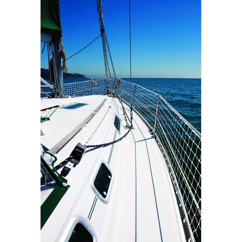 Rete di protezione per imbarcazioni, adatta ad essere fissata alla battagliola, al pulpito o come portaoggetti. Tessuta con treccia di nylon, alta tenacità. Ø mm 2, maglia quadrata mm 45x45, annodata a mano. Altezza cm 40 lunghezza mt 30