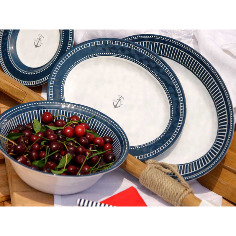 Servizio da tavola realizzato in melamina al 100%, BPA free. Sui toni del blu navy e bianco, il suo design martellato dà l’effetto della porcellana. Lavabili in lavastoviglie. Dimensioni cm 41 x 29 e cm 35 x 26
